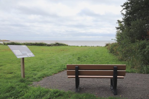 Le sentier passe à l’arrière du Musée des Pionniers et se dirige vers la côte en longeant un boisé sur une longueur de 134 mètres. Il traverse alors le boisé par-dessus un pont en bois qui enjambe un petit fossé. Il débouche sur une aire de repos avec vue sur la baie où sont installés un banc avec dossier et un panneau d’interprétation.