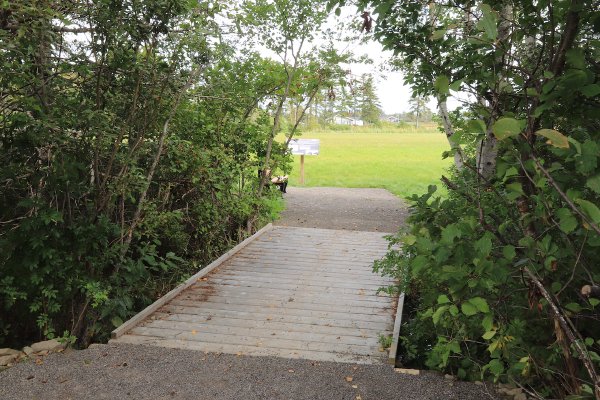 Le sentier passe à l’arrière du Musée des Pionniers et se dirige vers la côte en longeant un boisé sur une longueur de 134 mètres. Il traverse alors le boisé par-dessus un pont en bois qui enjambe un petit fossé. Il débouche sur une aire de repos avec vue sur la baie où sont installés un banc avec dossier et un panneau d’interprétation.